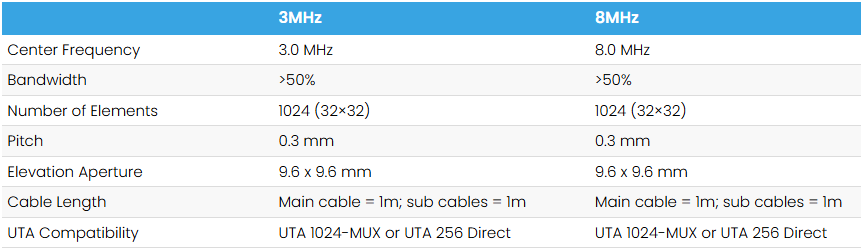 Matrix Arrays enable ultrafast acquisition of volume data. Utilizing 1024 elements in a 32×32 grid, and available in 3 and 8 MHz models, these transducers are compatible with the Vantage NXT and Vantage 256-channel Research Ultrasound Systems. Verasonics provides example scripts for multiplexed acquisition sequences using a single 256-channel system, as well as scripts for direct acquisition with four 256-channel systems for one-to-one channel-to-element connections.